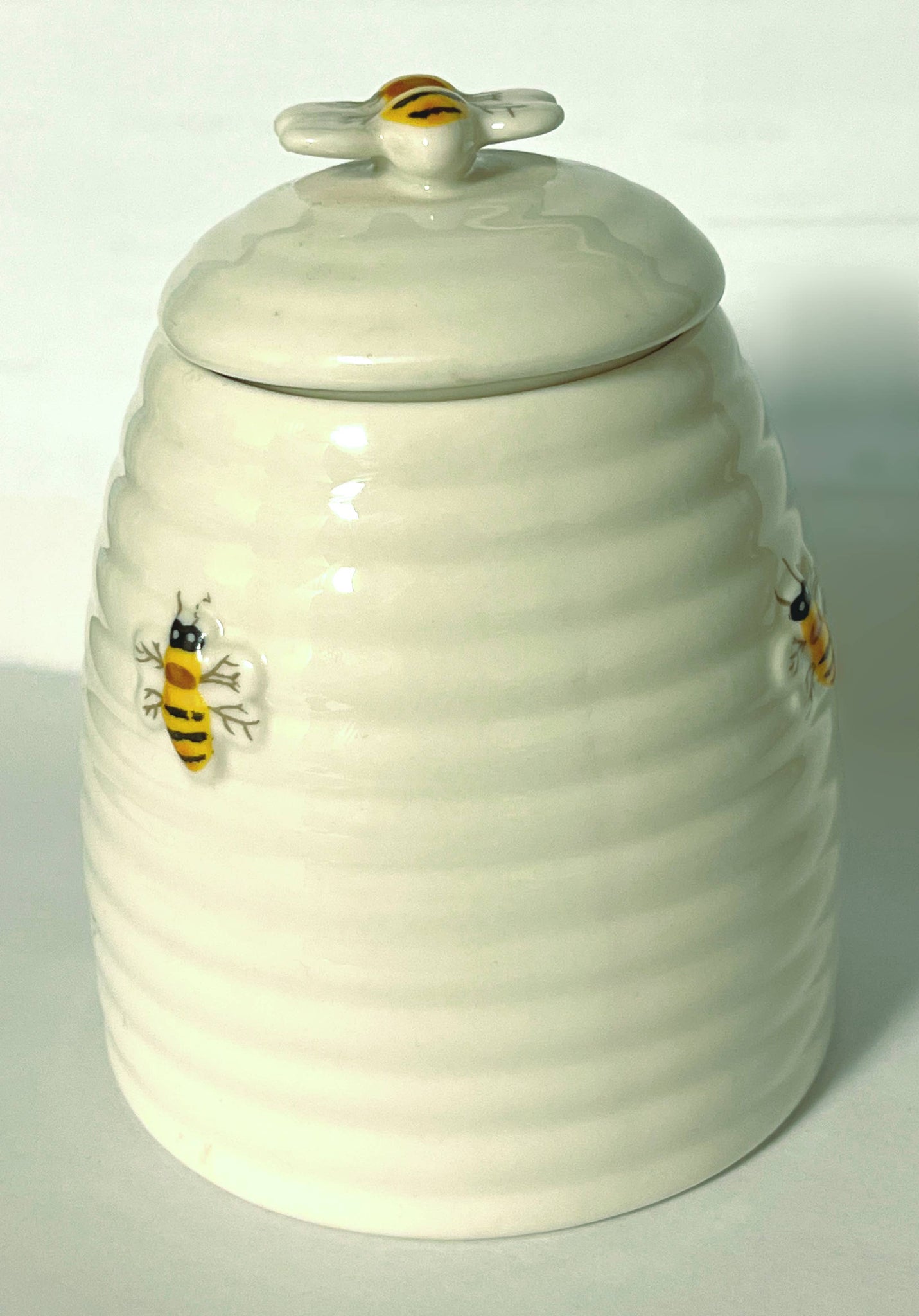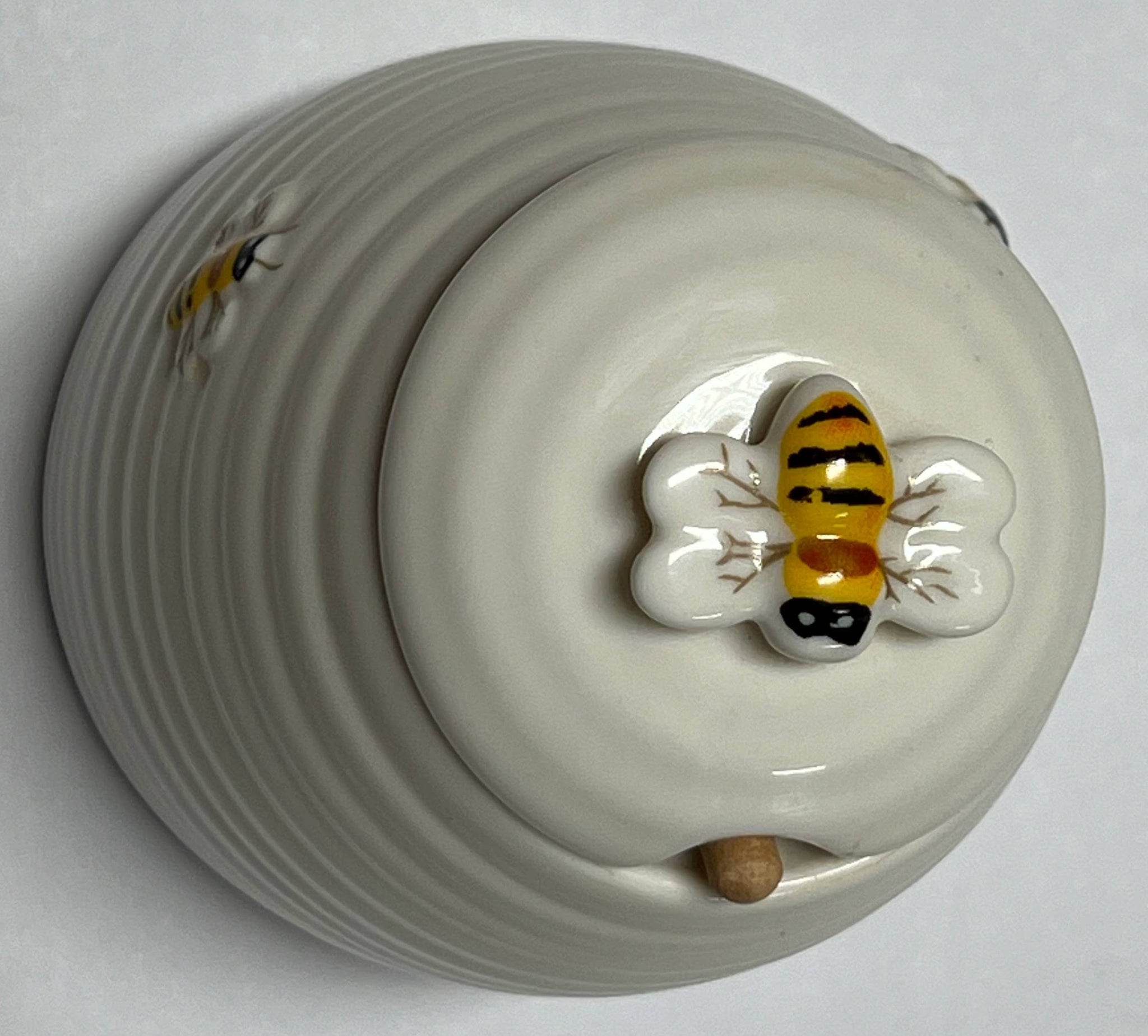 Beehive Honey Pot Measures: 3.5" x 4.5" This charming honey pot makes a sweet addition to any kitchen counter. Its hand-painted beehive design features busy bees and swirling across the ceramic in vibrant colors. Measuring 3.5" x 4.5", its generous 1 1/2 cup capacity is perfect for storing honey to enjoy with tea or toast. The included wooden dipper nestles neatly inside for serving straight from the jar. More than just a functional vessel, this pot will delight with its celebration of the hardworking honeybee. Its cute and colorful artwork also makes it a thoughtful gift for nature lovers, baking enthusiasts, or anyone with a sweet tooth. Store it proudly on the counter to remind of warmer seasons amid the busy hum of activity in the hive. Unique Design - Hand painted ceramic honey pot features a charming beehive design with bees for a touch of nature on your countertop.
